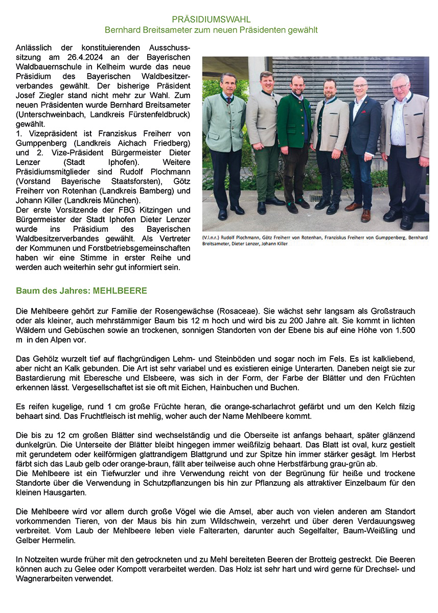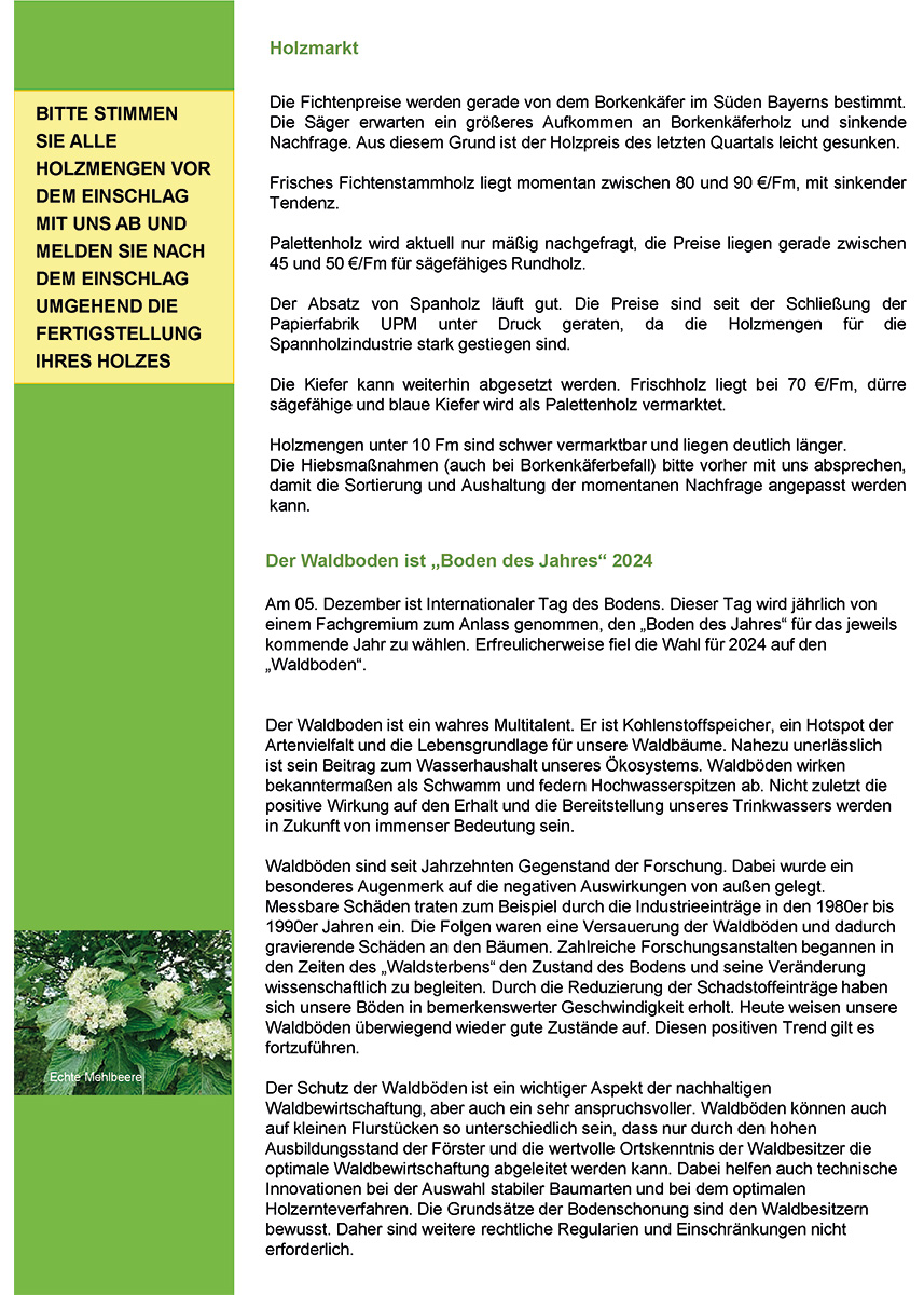 Jedes Mitglied bekommt 4 x im Jahr per Post das „Rundschreiben“ zugesandt, in dem aktuelle Themen zum Wald sowie Termine mitgeteilt werden. Dem Rundschreiben ist die Zeitschrift „Der bayerische Waldbesitzer“ des Waldbesitzerverbandes mit weiteren interessanten Beiträgen zum Thema Forst beigelegt.